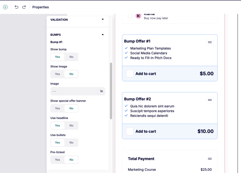 The bump offer appears inside your checkout element automatically, but you’re welcome to move the bump around within that checkout element. You can add up to 5 bump offers per checkout.
