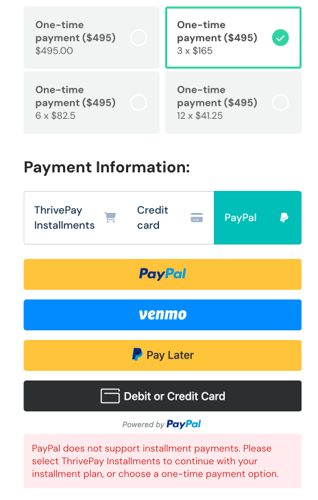 Customers choosing to pay with other payment methods such as Credit Card or PayPal, who may have selected an Installments pricing option, will see an error message directing them to choose the full priced payment option: