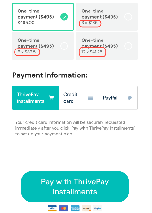 While your customer pays over time, ThrivePay Installments pays you immediately, and you receive the full payment upfront (minus processing fees).